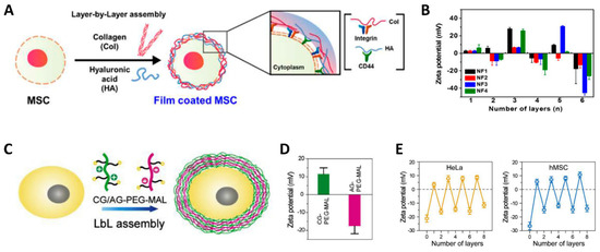 Schematic illustration indicating LbL assembly and the change in surface charge at each layer deposition. (A,B) Schematic illustration indicating the procedure of LbL assembly alternating Col I and HA deposition and surface charges after the deposition of each layer. Odd numbers indicate Col I deposition, and even numbers indicate HA deposition. Reprinted with permission from reference [9]. Copyright 2017 American Chemical Society. (C–E) Schematic illustration indicating the procedure of LbL assembly alternating cationic gelatin-PEG-maleimide (CG-PEG-MAL) and anionic gelatin-PEG-maleimide (AG-PEG-MAL). The surface charge of CG-PEG-MAL and AG-PEG-MAL was confirmed by Zeta potentila, and the surface charge of the cells during LbL deposition alternated between anionic and cationic states. Reprinted with permission from reference [18]. Copyright 2019 Elsevier.