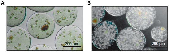 Hepatocytes encapsulated in alginate-chitosan-alginate microcapsules (A) and alginate microbeads (B). Reprinted after modification with permission from reference [25]. Copyright 2015 Taylor & Francis.