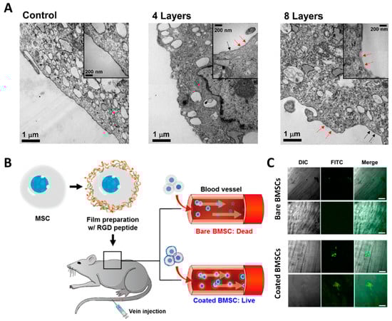 Surface modification of BM-MSCs by LbL assembly using PLL/HA resulted in nano-thin films around the cell plasma membrane surface. LbL-assembled layers resulted in a 20-nm-thick discontinuous and patch-like structure. Although this structure seemed unsturdy, both in vitro and in vivo cell survival was significantly potentiated, and improved recruitment to the wound site was observed in the muscle injury animal model (Figure 4) [7,9,55].
