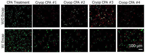 During the cryopreservation of animal cells, a cryoprotective agent (CPA) such as DMSO was used to suppress the damage caused by ice crystal formation. Although there is some controversy about the active concentrations, the CPA has a negative effect on cell activity-inducing proliferation arrest or cytotoxicity. Many reports show that a CPA such as DMSO results in reduced proliferation at a concentration of around 1–2%, and a concentration over 10% causes the cell number to decrease due to cytotoxicity [70]. However, during the cryopreservation of animal cells, ice crystal formation results in damages of cell plasma membrane integrity, and this destructive effect is greater compared with the damage caused by CPA. Additionally, cellular membrane damage can lower cell recovery upon thawing. Porcine adipose-derived stem cells (ADSCs) are also highly susceptible to the damage caused by ice formation during the cryopreservation process. When the porcine ADSCs were encapsulated with alginate shell structures, damage caused by cryopreservation decreased 3.5-fold, even with a lower concentration of the CPA (Figure 5) [33].
