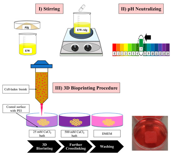 As the intact eggwhite fluid lacks extrudability, alginate as an extrusion enhancer was added to the plain eggwhite in the minimum possible amount. As a result, eggwhite could benefit from the ionic crosslinking feature of alginate to form a stable configuration in the presence of CaCl2 after 3D bioprinting.