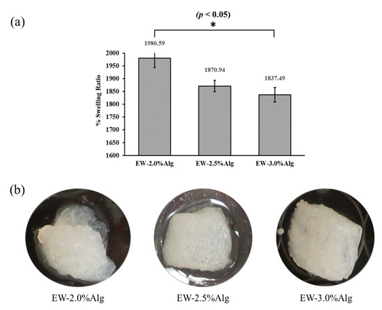All three groups of patches showed swelling ratios of more than 1800%. The highest value was exhibited by the EW-2.0%Alg patch, representing a strong ability to uptake the PBS as a liquid representative of body fluids. The highly porous structure of the printed patches can deliver and retain the body fluid in the damaged area of the tissue and provide an enriched environment that can expedite vascularization and tissue regeneration (see Figure 4a and Appendix A).