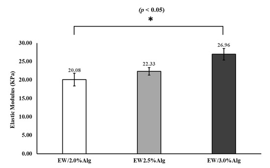 As illustrated in Figure 5, by increasing the alginate concentration, the elastic modulus increased. This increase in elastic modulus reflected the crosslinked structures within the construct due to having a more ionically condensed blend in higher concentrations. i.e., due to having more sodium alginate in the constructs, the proportion of Na+ exchanged with Ca2+ became greater, and more crosslinking formed more robust constructs. ANOVA analysis showed a p-value of <0.05 between all groups. Pairwise T-test comparisons showed a significant difference in elastic moduli between EW-2.0%Alg and EW-3.0%Alg samples, although the change was not very notable per each additional 0.5% of alginate.