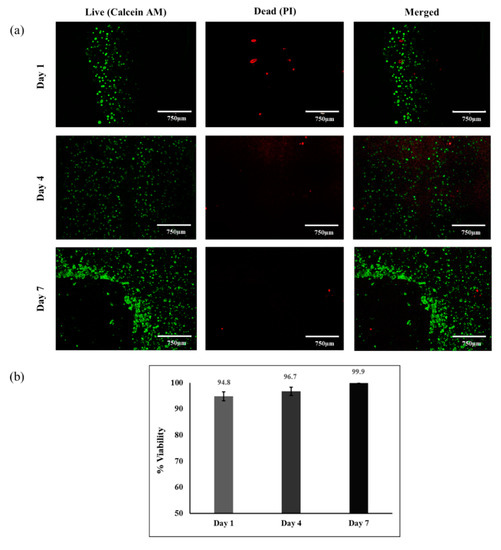 Cell viability and proliferation of 3D bioprinted HUVECs within the EW-2.0%Alg bioink by live/dead assay 1, 4, and 7 days after printing. (a) Fluorescent microscopy; (b) % cell viability.