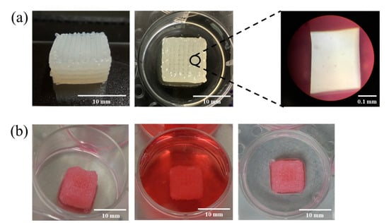 (a) Swelling behavior of 3D printed EW-Alg patches after 24 h in PBS solution; (b) Degraded patches after 28 days in PBS.