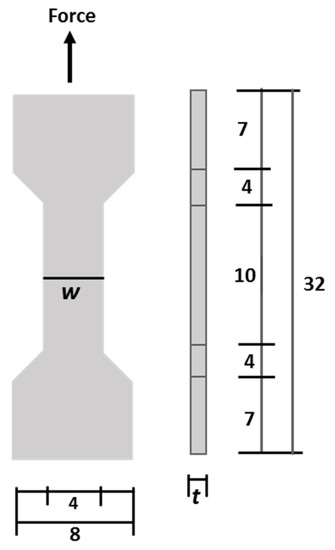 A dog-bone-shaped sample for mechanical testing. All dimensions in mm, w: width; t: thickness.