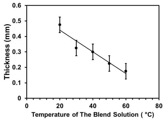Temperature variation of the blend solution affected the thickness of the tubular scaffold. As shown in Figure 2, as the temperature increased, the scaffold’s thickness decreased from 0.47 ± 0.05 mm to 0.17 ± 0.05 mm at 20 and 60 °C, respectively. It should be noted that the thickness represented here was measured using a digital caliper of accuracy ±0.1 mm.