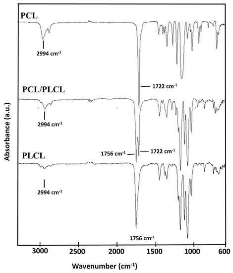 FTIR spectra of PCL, PLCL, and PCL/PLCL scaffold prepared from the 20 °C polymer solution.