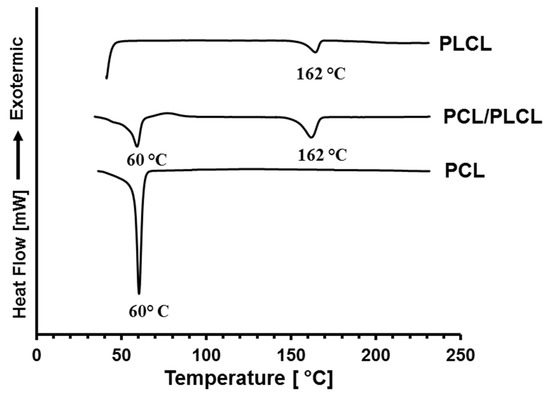 Figure 4 shows the thermal properties of PCL, PLCL, and PCL/PLCL blend scaffolds characterized by using DSC. DSC thermogram of neat PLCL exhibits single endothermic melting points at 162 °C and the melting point of neat PCL is observed at 60 °C. Two endothermic melting points at 60 and 162 °C, are observed in the PCL/PLCL blend thermogram, indicating that the two phases of polymers existed in the blend.
