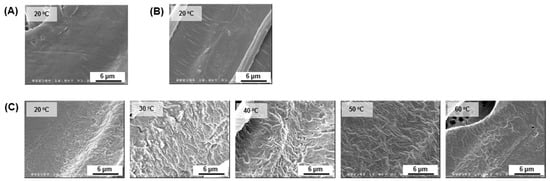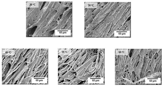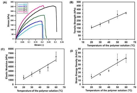 Mechanical properties of the blend scaffolds with the effect of temperature variation are shown in Figure 11. The stress–strain curve (Figure 11A) indicates a steeper curve as the temperature of the blended solutions increased. The ultimate tensile strength (Figure 11B) improved by more than two-fold higher, from 162 to 417 kPa, when the temperature successively increased from 20 to 60 °C, respectively. Elastic moduli (Figure 11C) significantly improved to 7372 kPa at 60 °C. The increase in elastic moduli means that the material’s stiffness is also increased. The strain energy density (SED) (Figure 11D) also tends to increase with the increased temperature of the blend solutions.