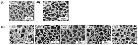 FE-SEM images of the surface morphology of a porous scaffold made of (A) neat PCL prepared from pure PCL solution at 20 °C, (B) neat PLCL prepared from pure PLCL solution at 20 °C, and (C) PCL/PLCL blends as the temperature of the blend solution was increased to 20, 30, 40, 50, and 60 °C.