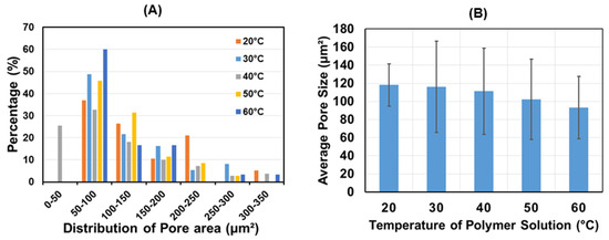 Based on FE-SEM images obtained, the pore distribution and the average pore size of the PCL/PLCL scaffolds were calculated, as shown in Figure 7. The pore distribution showed that the pore area of all scaffolds ranged from 50 to 350 μm2 with the majority of pore sizes in the range of 50 to 100 μm2. The trend of the mean pore size (Figure 7B) decreased with increasing temperature from 118 ± 23 μm2 (at 20 °C) to 93 ± 34 μm2 (at 60 °C) although no significant difference was observed.