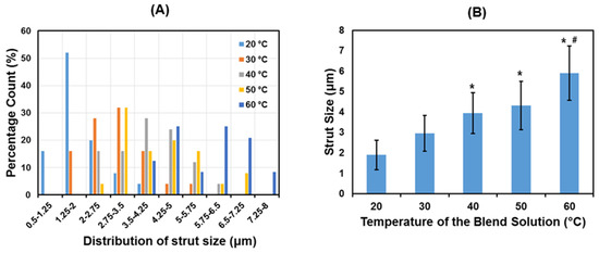 Figure 8A,B shows the distribution of the strut size and the average strut size of PCL/PLCL scaffolds. The strut distributions (Figure 8A) shift towards a bigger size as the temperature of the blend solution increases. The average pore size (Figure 8B) also tends to increase significantly from 1.89 ± 0.71 to 5.9 ± 1.3 μm.