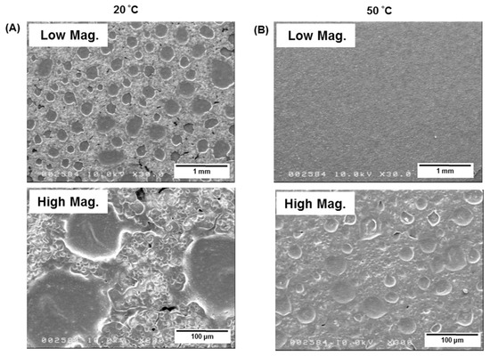 FE-SEM images of PCL/PLCL blend film prepared from the blend solutions at (A) 20 °C and (B) 50 °C by the solvent casting method.