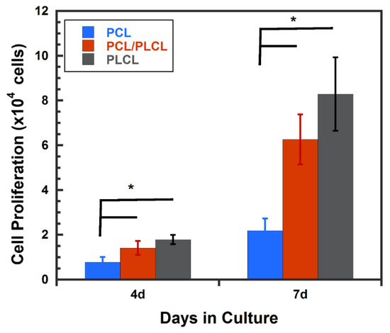 The cytocompatibility test was performed on the PCL and PCL/PLCL scaffolds prepared from the 20 °C polymer solution. The PCL scaffold had a significantly lower cell proliferation rate than PCL/PLCL scaffolds at 4 and 7 days in culture (Figure 12). This result suggests that PLCL is more favorable for cell growth compared to PCL, although the exact reason for the increased cell growth on PLCL is still unclear. It is known that PCL has a linear alkyl chain that contributes to its hydrophobicity [28], meanwhile PLCL, though it also contains an alkyl chain from the caprolactone backbone, copolymerization with lactide make it less hydrophobic [13]. The difference in surface wettability between PCL and PLCL [29] may contribute to the increase in cell proliferation. However, further study is required to address this finding.