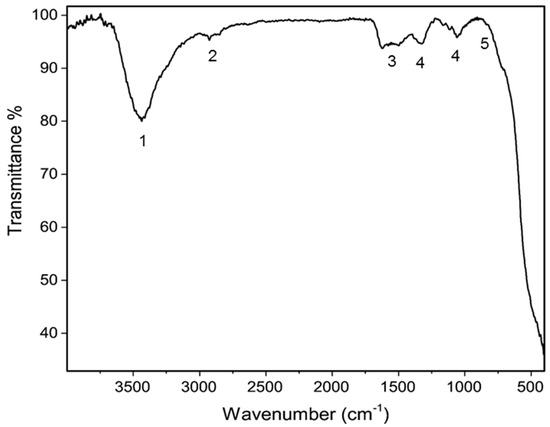 The FTIR spectrum of the CuO/CeO2 NCs (1, absorbed H2O or O–H stretching; 2, C–H stretching; 3, O–H stretching; 4, Ce–O–Ce vibration; 5, Ce–O/Cu–O vibration).