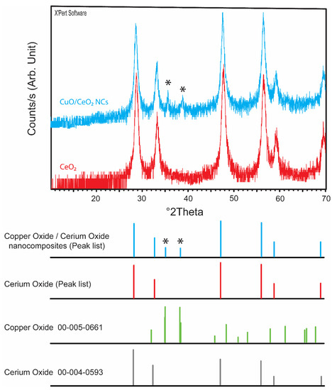 PXRD analyses of the CeO2 NPs and CuO/CeO2 NCs. * highlight the peaks interpreted according to the bottom part of the figure.