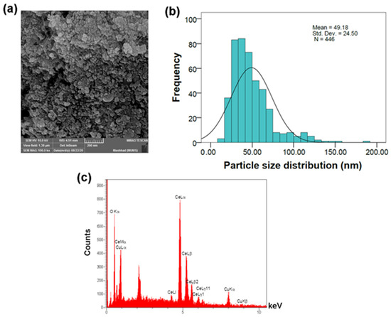 (a) FESEM images, (b) particle size distribution and (c) EDX analysis of the CuO/CeO2 NCs.