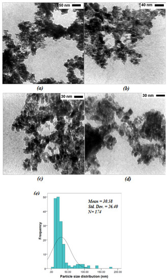 TEM images (a–d) and particle size distribution (e) of the CuO/CeO2 NCs.