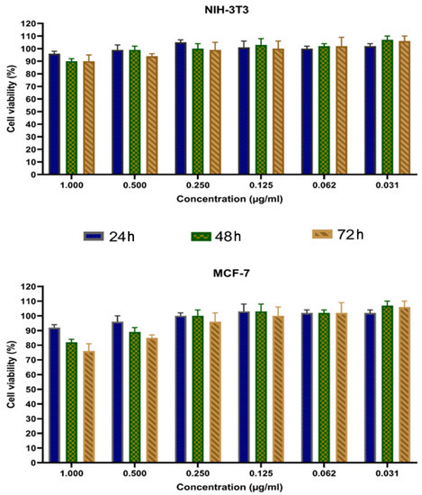 Cancer is a leading cause of death and a worldwide health problem [51]. Cancer is a disease characterized by uncontrolled cell proliferation that spreads from an initial focal point to other parts of the body to cause death [52,53]. In the past few decades, the application of nanocomposites in cell toxicity and anticancer properties has attracted a lot of attention with several nanoparticle types being used [54]. In this study, the cell toxicity effect of synthesized CeO2-CuO-NPs was measured through MTT assay against a breast cancer cell line (MCF-7) and normal fibroblastic cells. The result of the cytotoxic effect of synthesized nanoparticles (0.031–1.000 μg/mL) is shown in Figure 6 after 24, 48, and 72 h incubation. The results showed that there was a gradual decrease in cell vitality with increasing NC concentration, and this effect was more pronounced for longer incubation times using higher NC concentrations. This trend is clearly visible in cancer cells, where there is a marked decrease of cell viability over time if the NC concentration exceeds 0.250 μg/mL). Overall, the destruction of cancer cells occurs in a state dependent on both concentrations of CuO/CeO2 NC and time of exposure. On the contrary, normal fibroblastic cells seem to be less sensitive to the presence of NC. These results are in accordance with the findings reported in some previous studies that are briefly described below.