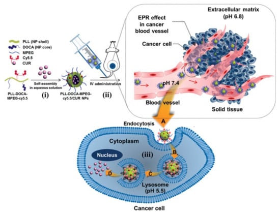 Schematic of the endocytosis of poly-(L-lysine)-deoxycholic acid-methoxy polyethylene glycol-cyanine 5.5/Curcumin nanoparticles into cancer cells and mechanism of the nanoparticles on the apoptosis of the cells. Reproduced with permission from Yang et al. []. (i) Self-assembly of poly-(L-lysine)-deoxycholic acid-methoxy polyethylene glycol-cyanine 5.5/Curcumin nanoparticles in aqueous solution (ii) After IV administration NPs circulate through various pH circumstances from veins to the tumor via EPR, and (iii) Endocytosis of poly-(L-lysine)-deoxycholic acid-methoxy polyethylene glycol-cyanine 5.5/Curcumin nanoparticles into cancer cells.