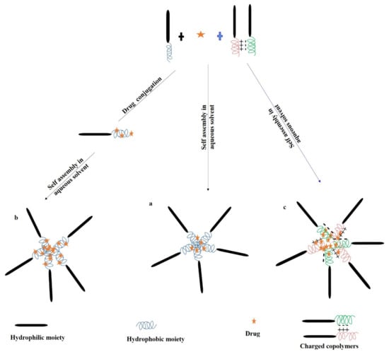 Common types of polymeric micelles: (a) block copolymer micelle; (b) drug-conjugated block copolymer micelle; and (c) block ionomer complex micelle. Modified from [].
