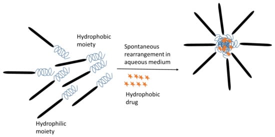 Spontaneous formation of micelles from amphiphilic molecules in aqueous media, while entrapping hydrophobic drugs.