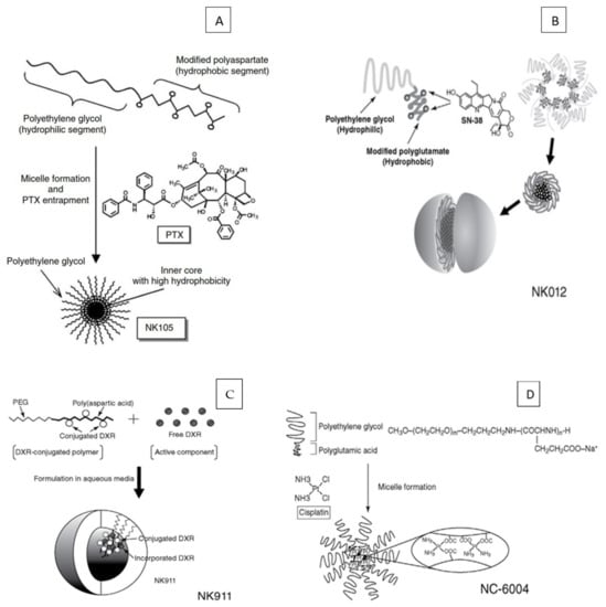 Schematic presentation of poly(amino acid)s-based micelles systems: (A), NK105, (B) NK012, (C) NK911, (D) NC-6004. (Reproduced with permission from Refs. [,]).