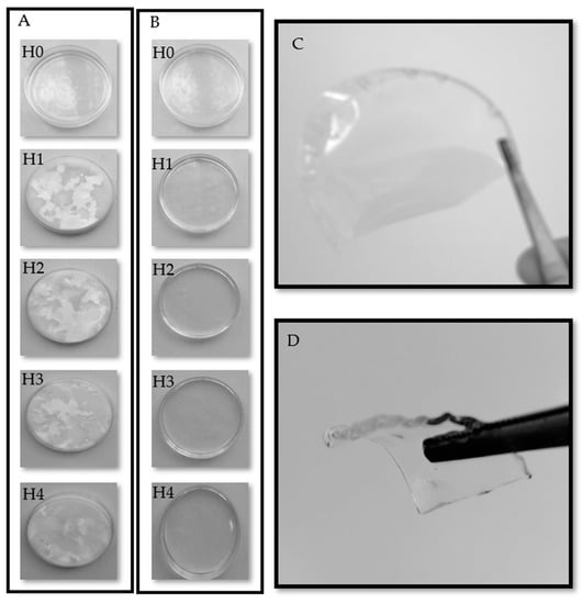 Macroscopic images were obtained from the hydrogels during preparation, especially when the freeze–thaw method was used for crosslinking. Figure 1A presents the images of the hydrogels after freezing. Except for sample H0 which was not frozen, crystalline regions are observed for all the other samples after freezing. As mentioned in the Introduction, the freeze–thaw method can induce crystalline regions in the structure of PVA. The crystalline regions are observable when the solutions are frozen, and they disappear after thawing (Figure 1B). The crystallinity of the final hydrogel can be detected by characterization methods such as XRD, as discussed in the next section. The final product of this research is a dry hydrogel film (Figure 1C). The films are flexible and after placing in water they swell in all dimensions (Figure 1D).