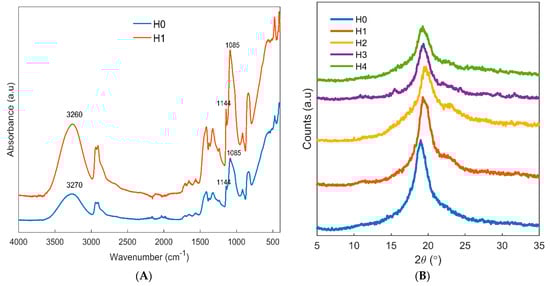 The FTIR spectrum of chitosan/PVA samples with and without the freeze–thaw treatment was obtained to monitor the changes induced by the freeze–thaw method in the chemical structure of the films. Both the samples showed the characteristic peaks related to the chemical groups of chitosan and PVA (Figure 2A). The band at 3270 cm−1 for the sample without the freeze–thaw treatment (H0) is related to the vibrations of the N-H and -OH groups of chitosan, as well as the hydroxyl groups of PVA. One strong peak in this region indicates favorable hydrogen bonding interactions between chitosan and PVA in the blend. After applying the freeze–thaw process (H1), this peak was shifted to 3260 cm−1, indicating that these groups need higher energy for their vibrational motions due to stronger interactions. The two peaks observed at 2940 and 2900 cm−1 for both samples are related to the stretching vibrations of the CH2 groups. Other peaks observed in the spectra of both samples are characteristic peaks of the chemical groups present in chitosan and PVA. The peaks at 1412 and 1375 are related to CH bending vibrations in the CH2 and CH3 groups. The peak at 1144 cm−1 can be assigned to C-C vibrations. The peak at 1085 cm−1 is related to the overlapping C-O stretching vibrations of chitosan and PVA. These two peaks are crystallinity-sensitive bands of PVA, in which the ratio of the absorbances can be used to calculate the degree of crystallinity of PVA according to a formula published in the literature [39]. According to this method, the degree of crystallinity was determined for the H0 and H1 samples using the ratio A1144/A1085. It was found that the degree of crystallinity increased from 38% for the non-freeze–thawed H0 sample to 42% for the freeze–thawed H1 sample. This result, in accordance with previous reports [10], indicates that the freeze–thaw process can increase the crystallinity of PVA/chitosan samples, as discussed further when considering the XRD results.