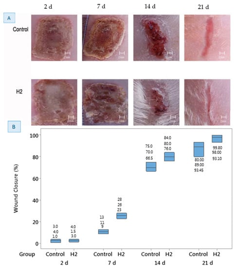 (A) Photographs of the wound repair for control and H2 hydrogel after 2, 7, 14 and 21 days. (B) Boxplot of the average area of the wound closed (%) at different healing times for control and H2 hydrogel.