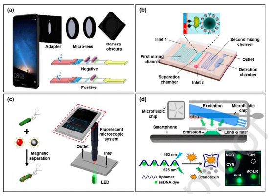 - Wang, S.; Zheng, L.; Cai, G.; Liu, N.; Liao, M.; Li, Y.; Zhang, X.; Lin, J. A microfluidic biosensor for online and sensitive detection of Salmonella typhimurium using fluorescence labeling and smartphone video processing. Biosens. Bioelectron. 2019, 140, 111333. [Google Scholar] [CrossRef] [PubMed]