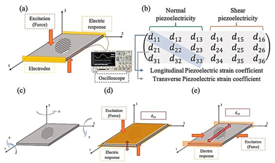 There are two different types of PE—normal and shear. Normal PE is attributed to the materials that respond to the applied force directly. When the structure deforms in the X, Y, or Z directions, the electrical charge accumulates on one of the mentioned directions of the specimen. When an excitation charge is applied to the sample, volume accretion emerges in the same way. The shear PE definition is the material’s structural twist in response to the electrical stimulation [22]. A complete comprehensive schematic that illustrates PE is presented in Figure 1.