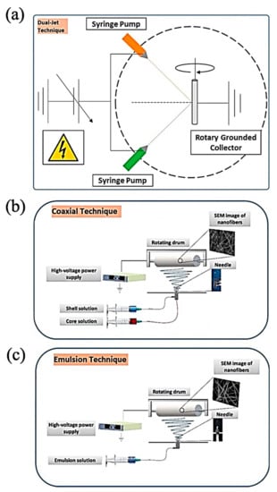 Schematic diagram of electrospinning: (a) Two-syringe technique, (b) Double channel nozzle technique, and (c) Single-nozzle technique; Adapted from [53], with permission from International Journal of Biological Macromolecules; Elsevier, 2021.