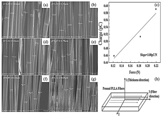 Scanning electron microscope (SEM) images of electrospun PLLA fibers fabricated at the distance of 10 cm from the needle to the rotational mandrel, a flow rate of 1 mL h−1: (a) 1000 rpm, 9 kV; (b) 1000 rpm, 12 kV; (c) 3000 rpm, 15 kV; (d) 2000 rpm, 9 kV; (e) 3000 rpm, 9 kV; (f) 3000 rpm, 12 kV. (g) Charge versus force plot for dynamic d33 test of the electrospun PLLA fiber bundles; (h) definition of coordinates for electrospun PLLA fiber bundles; Adapted from [63], with permission from Macromolecular Materials & Engineering; Wiley-VCH, 2015.