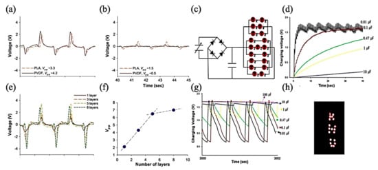 (a) Effect of constructive and (b) destructive stacking for PVDF and PLA nanofiber web-based sensors; (e) changes in piezoelectric output signal with increasing PLA nanoweb stacks and (f) its Vp–p comparison plot. (c) The equivalent circuit diagram to operate LED diodes; charging voltage vs. time when LEDs were (d) not connected and (g) connected for more than 3000 s for capacitors having different capacitances; and (h) photograph of LEDs operated using a 100 mF capacitor; Adapted from [64], with permission from Materials Letters, Elsevier, 2015.
