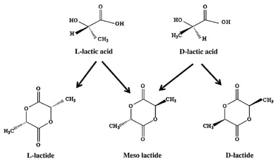 Polylactide acid stereo forms: L-lactide, D-lactide, and meso-lactide; Adapted from [66], with permission from Bioresource Technology; Elsevier, 2010.