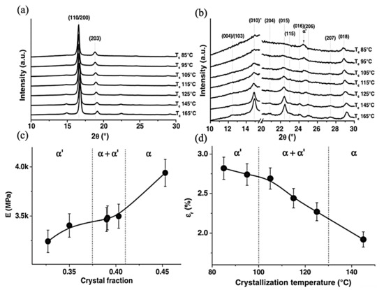 Cocca et al.’s fabrication technique was composed of compression-molded and quenched samples followed by an annealing process; they contended that by increasing the annealing temperature, the reflections of (110)/(200) and (203) planes shift to higher angles together with an increase in the intensity of the (010) and (015) planes. Furthermore, at the diffraction peaks at 2θ = 12.5, 20.8, 23, 24.1, and 25.1, they would appear at higher crystallization temperatures which are assignable to the reflections of the (004)/(103), (204), (115), (016), and (206) planes of α polymorphism, respectively. In comparison, they will not appear at temperatures lower than 95 °C. The formation of α’ could be attributed to this temperature. The α and α’ polymorphism is highly related to their molecular weight; in the reported paper, the construction of α is devoted to temperatures higher than 145 °C, and in the range of 105–125 °C, both α and α’ are able to be achieved at the 95 °C that is associated with α’. As shown in Figure 6, the research article also studies the correlation between the crystalline phases and the mechanical properties. The relation of Young’s modulus and crystal fraction increases but not in a linear trend for semicrystalline materials, resulting from the mobile amorphous fraction, which implies applied stress transformation across the amorphous–crystalline interface and can affect the response of semicrystalline structure [103].