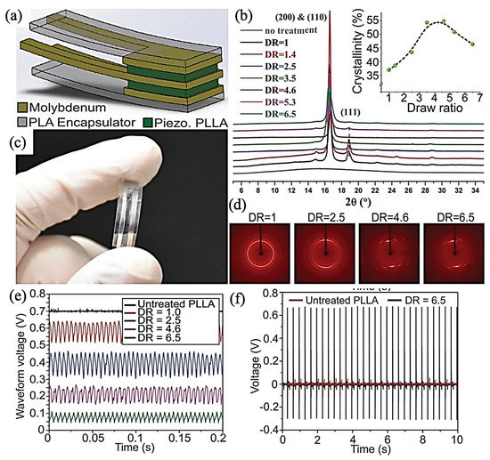- Lovell, C.S.; Fitz-Gerald, J.M.; Park, C. Decoupling the effects of crystallinity and orientation on the shear piezoelectricity of polylactic acid. J. Polym. Sci. Part B Polym. Phys. 2011, 49, 1555–1562. [Google Scholar] [CrossRef]