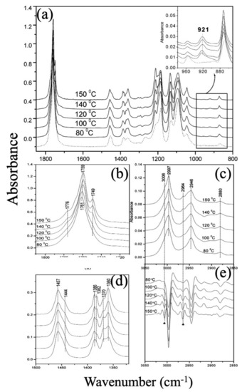 (a) IR spectra in the range 1850–800 cm−1 of various PLLA samples prepared by annealing at different temperatures from the amorphous state as indicated on the lines for 1 h; (b,d) Enlarged IR spectra of PLLA samples prepared by annealing at 80, 100, 120, 140, and 150 °C (b) 1810–1710 cm−1, (d) 1500–1320 cm−1; (c,e) IR spectra and the second derivatives in the 3050–2850 cm−1 region of PLLA samples prepared by annealing at 80, 100, 120, 140, and 150 °C; Adapted from [121], with permission from Macromolecules; American Chemical Society Publications, 2005.