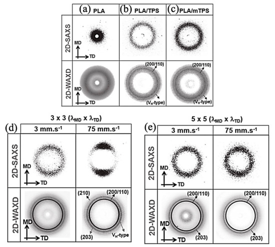 The 2D-SAXS and 2D-WAXD patterns of (a) PLA, (b) PLA/TPS, and (c) PLA/mTPS precursor sheets, respectively. (d,e) The 2D-SAXS and 2D-WAXD patterns of BO-PLA/TPS with varied stretching rates and draw ratios (3 × 3 and 5 × 5); Adapted from [124], with permission from Macromolecular Materials and Engineering; Wiley-VCH, 2019.
