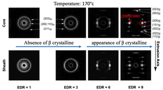 In order to understand the PLLA crystalline structure phase transformation, mold casting at numerous temperatures and various drawing ratios was considered [115]. The best results to analyze were achieved when the temperature intervened between Tm and Tg at 170 °C. While the extrusion drawing ratio (EDR) was 1, 3, the α phase was achieved with any texturizing crystalline planes, while at higher drawing ratios of 3, 9, the β crystalline phase started to appear and texturization happened. The research denotes that the (200) of β phase crystalline plane coincides with appearing with (200)/(100) α at the lower drawing ratios, although at EDR = 11, the complete β crystalline phase is achieved with the absence of α. The results of this study are presented in Figure 10.