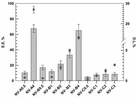 Based on reported data, NV-A4 and NV-B4 showed the best results in terms of EE%, 67.5 ± 5.2 and 65.2 ± 8.3, respectively. However, despite these values being very similar and no significant differences being found between each other, NV-A4 showed a D.L.% twice as high as NV-B4 due to the lower amount of lipid used (27 ± 1.7% vs. 13 ± 0.5%, respectively). For this reason, in addition to the suitable physicochemical properties shown above, NV-A4 was selected as the best one and used for further investigations.