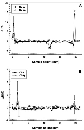 In these attempts, the two investigated formulations demonstrated ΔT% and ΔBS% below the threshold value for the entire sample’ s height during the analysis at room temperature, showing almost overlapping profiles (Figure 2). This finding is in agreement with our hypothesis related to the zeta potential value and confirms that the loading of rutin into ethosomes® did not compromise their physical stability. It is also noteworthy that NV-A showed slight variations in ΔT profile (even below than 5%) between 11 and 13 mm of the sample height (Figure 2A). Meanwhile, NV-A4 did not show this variation, confirming the previous hypothesis about the stabilization activity of rutin on the ethosomes’ structure. The only significant variations in ΔT profiles were observed at ca. 2 mm and ca. 20 mm of the sample height, even if this is not related to the occurrence of destabilization phenomena but probably because of the air bubbles in the glass vial at the top and bottom interfaces.