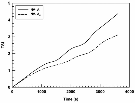 Moreover, the turbiscan stability index (TSI) confirmed the data obtained by the formulation profiles of ΔT% and ΔBS%, showing that the insertion of rutin in the nanostructure leads to an A4 TSI value lower than that of NV-A (Figure 3).