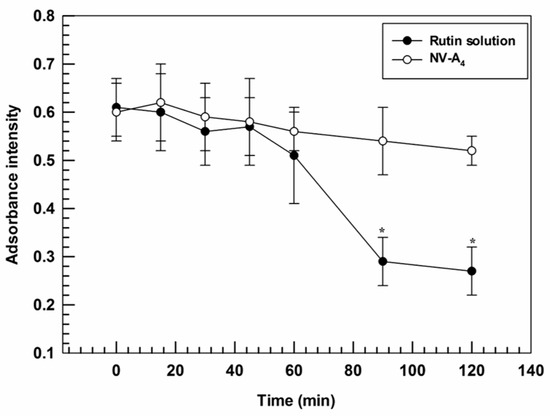 Degradation profile of NV-A4 and the free rutin solution as a function of UV-exposure time. The results are expressed as mean values of three independent experiments ± standard deviation. * p < 0.05 of rutin solution compared with NV-A4.