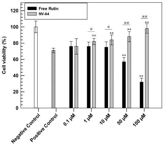 The evaluation of antioxidant features was carried out to confirm the efficacy of the designed loaded formulation. This investigation was performed through in vitro studies on the NCTC 2544 cell line using MTT tests (Figure 5). Briefly, to confirm the cytoprotective effect, a pre-treatment of 24 h with increasing concentrations of NV-A4 and rutin in free form was carried out on the NCTC 2544 cell line. Subsequently, oxidative stress conditions were mimicked by adding hydrogen peroxide (700 µM) for 1 h, leading to the formation and further accumulation of ROS [44]. After 1 h of induced stress, the MTT salts were metabolized into formazan crystals by living cells’ mitochondria. Finally, after crystals dissolution, the measured absorbances allow us to obtain a percentage of cell viability.