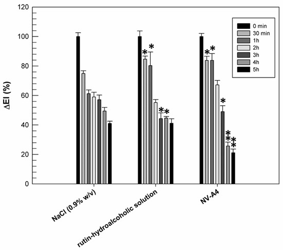 Erythema index variation (ΔEI%) measured after topical application of the NaCl solution (0.9% w/v), the rutin–hydroalcoholic solution, and rutin-loaded ethosomes (NV-A4), on inflamed forearms of human healthy volunteers. The results were expressed as mean values ± standard deviation. * p < 0.05 and ** p < 0.001 compared with NaCl (0.9% w/v), used as a control.