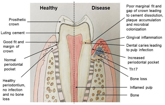 The fixed prosthetic constructions may cause inflammation, and when it becomes chronic, the adaptive mechanisms of immunity are stimulated, involving cellular and non-cellular immunity. These immune mechanisms have a critical role for the further limitation of the inflammatory reaction, and in the recovery process with the regeneration and the restoration of injured tissues. Thus, self- and acquired immune mechanisms should be synchronized to return the damaged tissue to homeostasis [65]. Ercoli and Caton [66] noted that the accumulation of plaque and loss of periodontal attachment is related to the type of prosthetic restorations. The margin of restoration located near the junctional epithelium can cause periodontal inflammation and gingival recession.