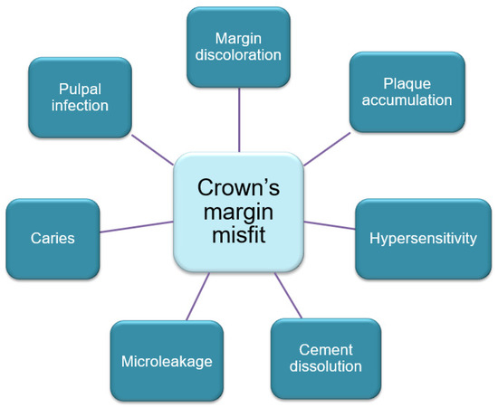 The accuracy of marginal and internal adaptation is essential for the final result and survival of a fixed prosthetic treatment. A marginal discrepancy results in thick cement, which is affected by the oral environment more, resulting in cement dissolution and deposition of dental biofilm, microleakage, margin discoloration, increased gingival crevicular fluid (GCF) flow, recurrent caries, pulp infection and, lastly, periodontal lesion and bone loss, which lead to the failure of prosthetic treatments [15]. Figure 2 shows an adequate margin fit of the crown and an inadequate margin fit leading to undesirable consequences. Hence, to protect the periodontium, especially the gingival margin and tissue-biomaterials interface, the fixed dental prosthesis should be appropriate, healthy, and durable [21].